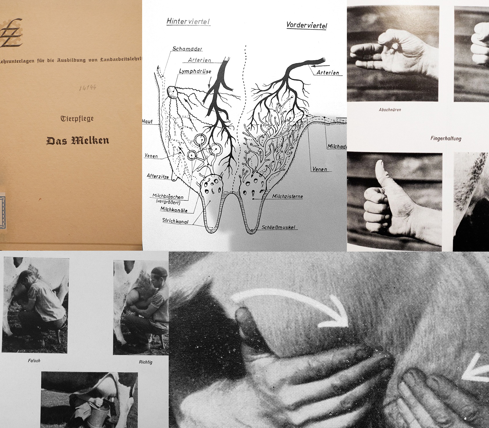 Páginas interiores de la publicación titulada Das Melken mostrando diversas técnicas de Infografía sobre cómo ordeñar una vaca
